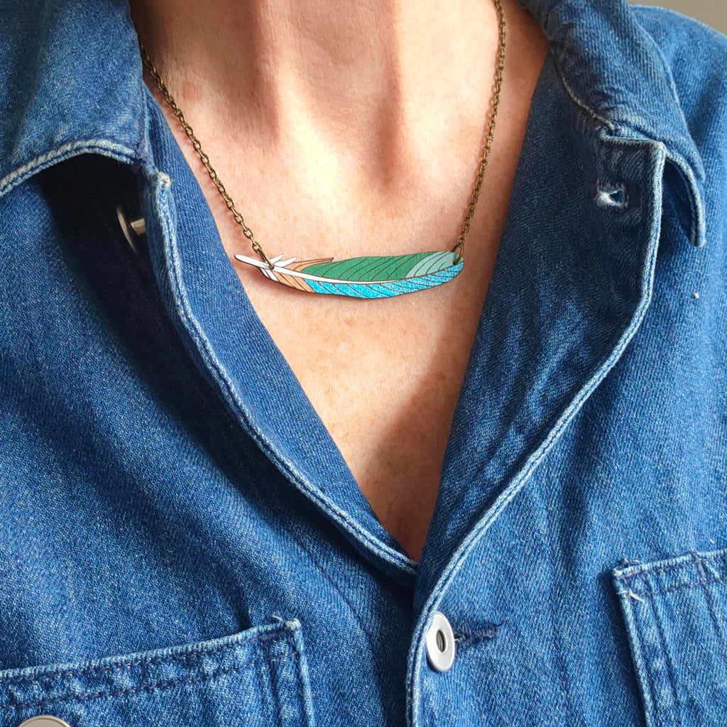 The design of this necklace is based on the feather of the Tui bird . It is made from rimu and is hand painted in white, green and blues with a touch of sparkle. They have been sealed with beeswax to protect.